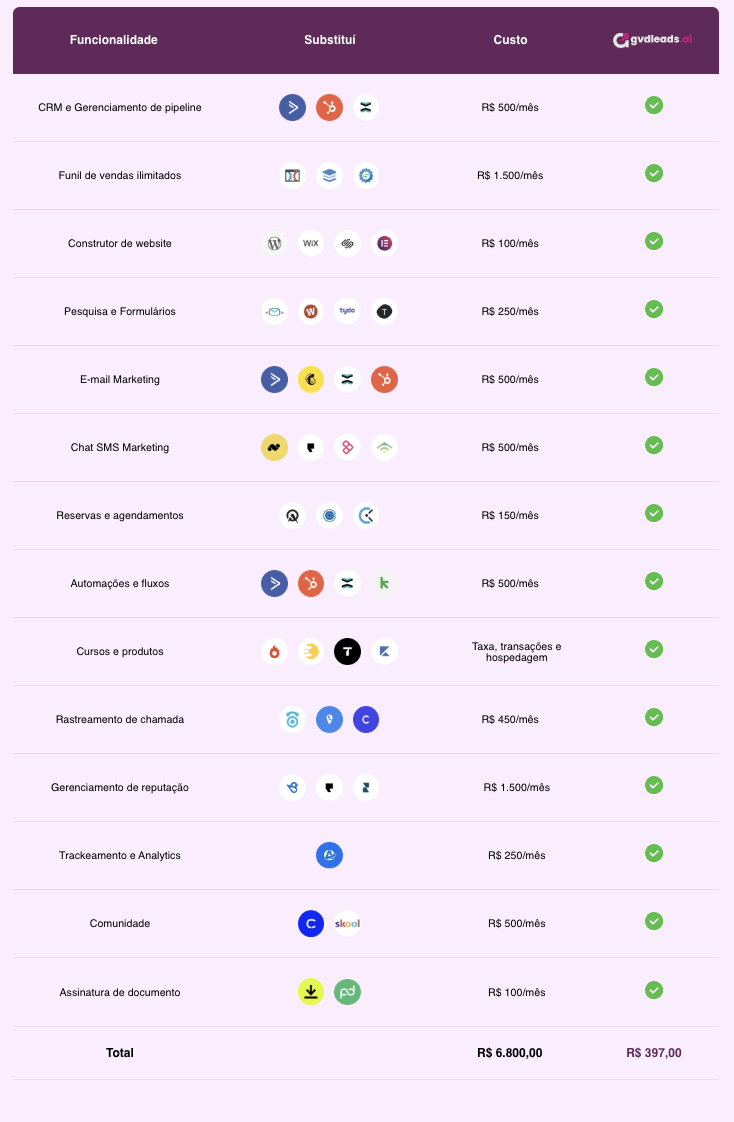 Pare de gastar com dezenas de ferramentas separadas. Agora você tem tudo em um só lugar, pagando muito menos e com muito mais resultado.